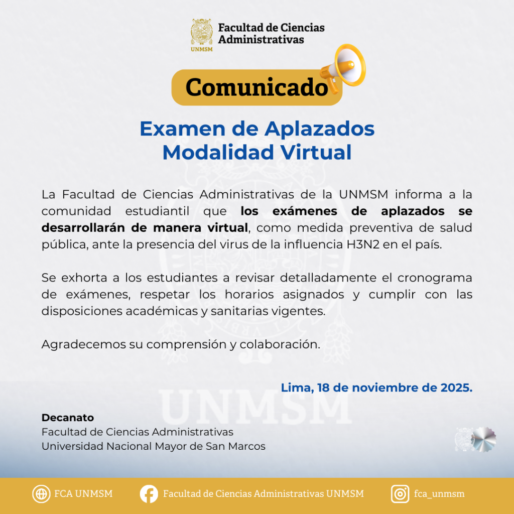 La Facultad de Ciencias Administrativas de la UNMSM informa a la comunidad estudiantil que los exámenes de aplazados se desarrollarán de manera virtual, como medida preventiva de salud pública, ante la presencia del virus de la influencia H3N2 en el país. Se exhorta a los estudiantes a revisar detalladamente el cronograma de exámenes, respetar los […]