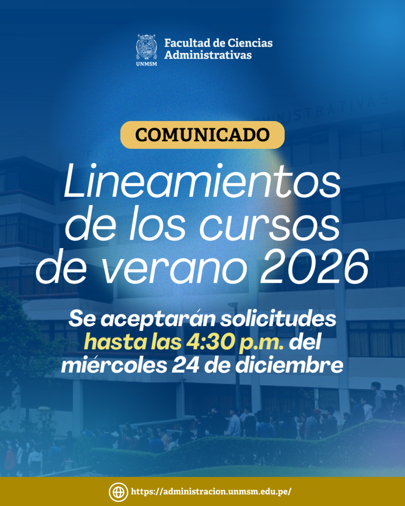 Estimados estudiantes se les informan que ya tenemos listos los lineamientos para los cursos de verano, asimismo, se aceptaran solicitudes hasta las 4:30 p.m. de HOY, miércoles 24 de diciembre. Ver RR. 014416-2025-RVer lineamientos
