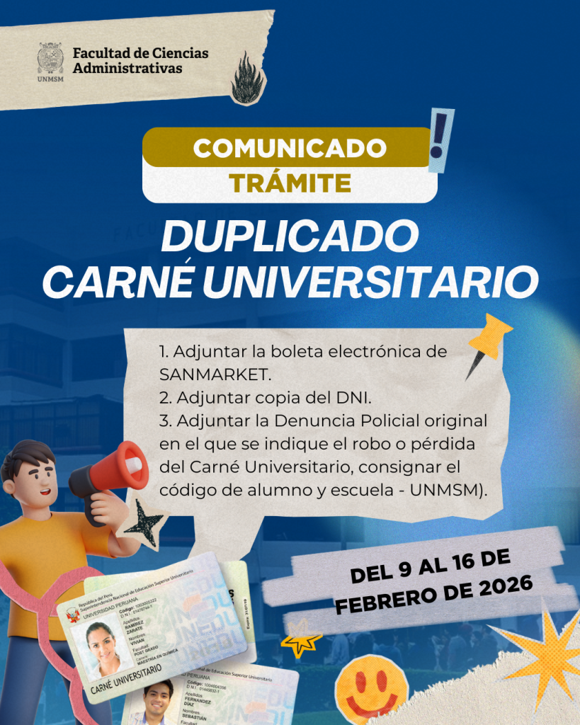 Se comunica a los alumnos regulares de las seis escuelas profesionales-FCA, que la Oficina de Secretaria General de la UNMSM, ha convocado por tercera vez el trámite de duplicado de Carné Universitario 2025, debiendo efectuar el depósito de S/ 17.70 soles, en SANMARKET, Se detalla requisitos y fecha de recepción: REQUISITOS: 1. Adjuntar la boleta […]