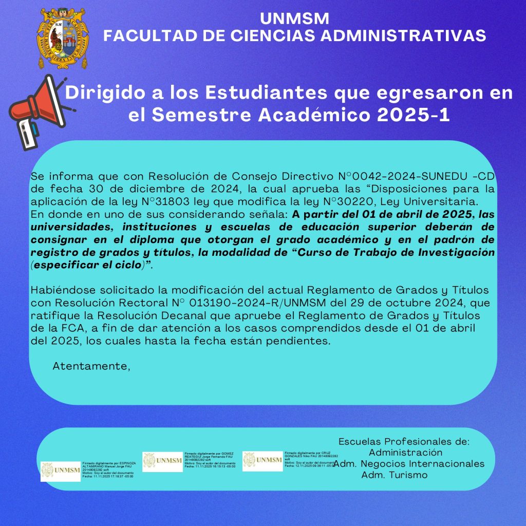 Se informa que con Resolución de Consejo Directivo N°0042-2024-SUNEDU -CD de fecha 30 de diciembre de 2024, la cual aprueba las “Disposiciones para la aplicación de la ley N°31803 ley que modifica la ley N°30220, Ley Universitaria». En donde en uno de sus considerando señala: A partir del 01 de abril de 2025, las universidades, instituciones y escuelas de educación superior deberán de consignar en el diploma que otorgan el grado académico y en el padrón de registro de grados y títulos, la modalidad de “Curso de Trabajo de Investigación (especificar el ciclo)”.