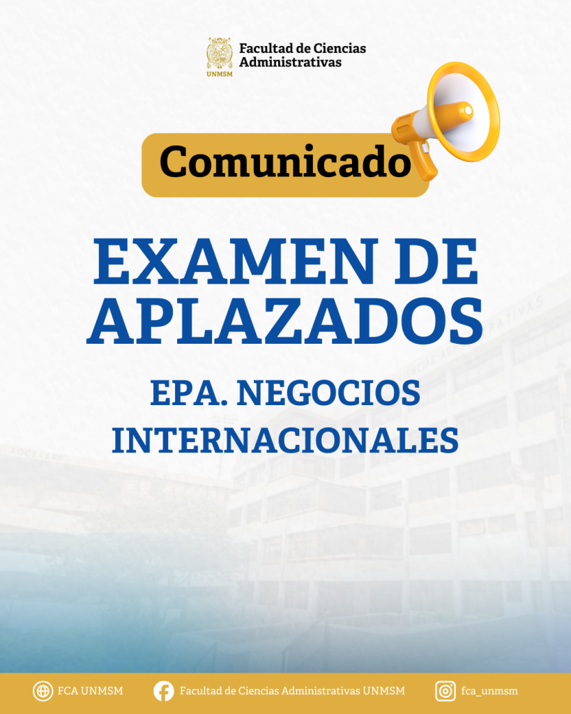 La Escuela Profesional de Administración de Negocios Internacionales (EPANI) informa a la comunidad estudiantil que se rige conforme a lo establecido en la Directiva para la Aplicación del Examen de Aplazados para estudiante de pregrado de la UNMSM, en ese sentido, todos los procedimientos, requisitos y disposiciones vinculados al desarrollo del examen de aplazados se ejecutarán siguiendo estrictamente lo indicado en dicha normativa vigente.
