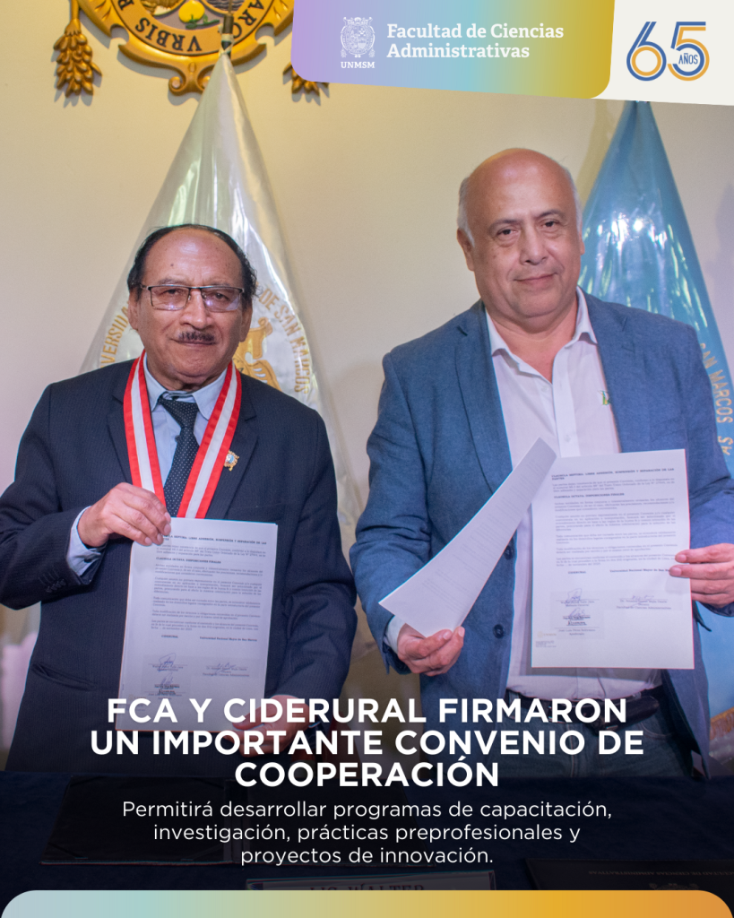 El acuerdo fue firmado por el decano de la FCA, Dr. Amador Grover Mejía Osorio, y el gerente general de CIDERURAL, Walter Jaime Yalle Jara, con el fin de establecer un marco de colaboración que fortalezca la formación académica, la investigación y la articulación con el sector cooperativo a nivel nacional.