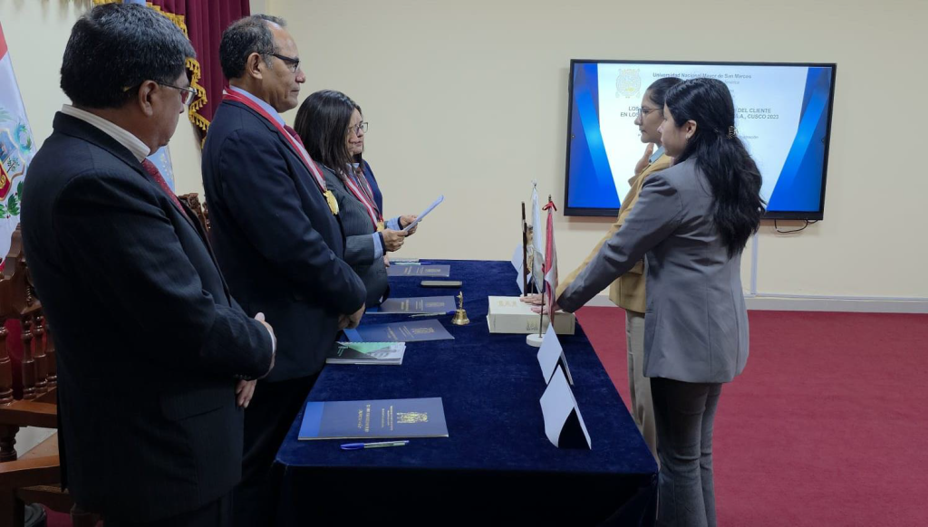 El jurado evaluador estuvo presidido por la Dra. María Celina Huamán Mejía e integrado por los miembros: Mtro. Xiomara del Rosario Huerta Munaya (miembro), Mg. Sergio Fernando Podestá Cuadros (miembro), Mg. Luis Ángel Fabián Sotelo (asesor) y certificado por el Dr. Juan Manuel Barreda Guerra, Vicedecano Académico de Pregrado de la Facultad de Ciencias Administrativas, en presencia del Dr. Manuel Jorge Espinoza Altamirano, director de la Escuela Profesional de Administración.