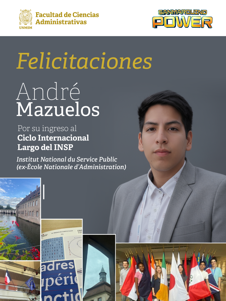 La Facultad de Ciencias Administrativas (FCA) de la Universidad Nacional Mayor de San Marcos (UNMSM), expresa su felicitación a André Alejandro Mazuelos Carpio, egresado de la Escuela Profesional de Administración de Negocios Internacionales, por haber logrado su ingreso al destacado programa “Ciclo Internacional Largo” del Institut National du Service Public, INSP (ex-École Nationale d’Administration) en Francia.