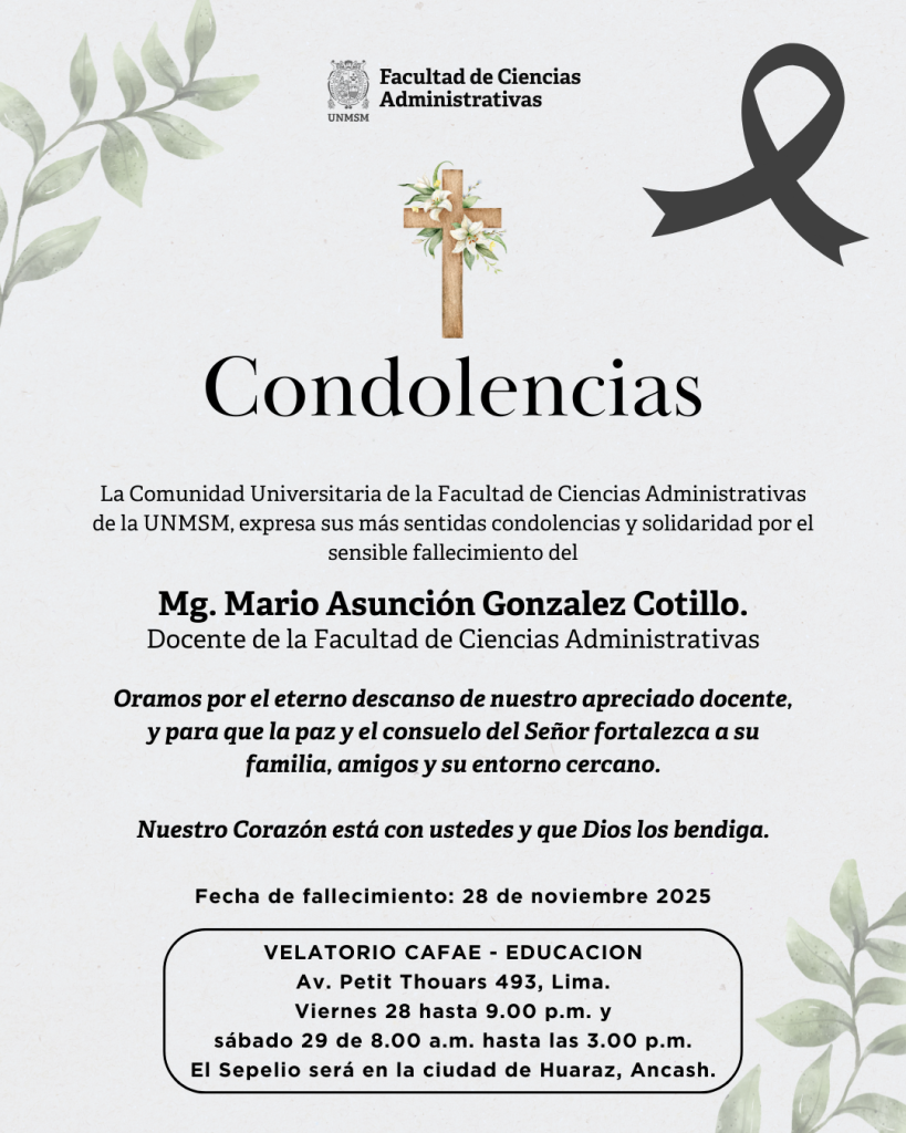 La Comunidad Universitaria de la Facultad de Ciencias Administrativas de la UNMSM, expresa sus más sentidas condolencias y solidaridad por el sensible fallecimiento del Mg. Mario Asunción Gonzalez Cotillo, docente de la Facultad de Ciencias Administrativas.