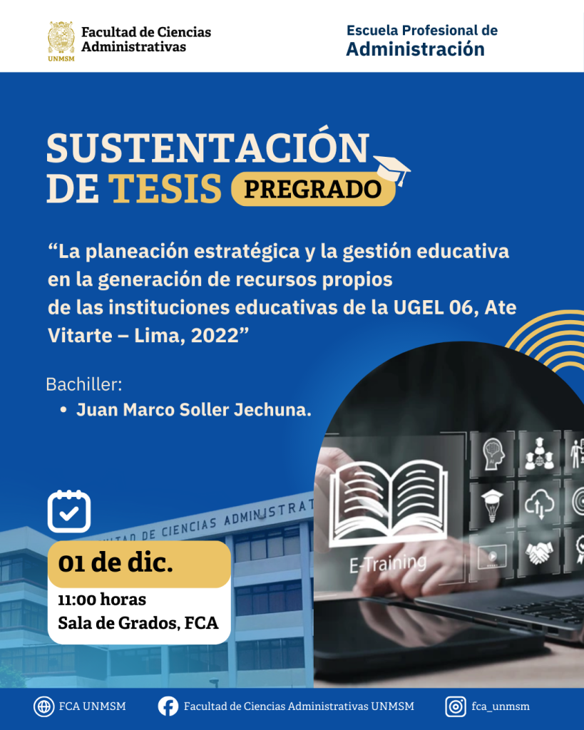 Se informa a la Comunidad Universitaria que el lunes 01 de diciembre del 2025 a las 11:00 am en el Salón de Grados de la Facultad de Ciencias Administrativas de la Universidad Nacional Mayor de San Marcos se llevará a cabo la sustentación presencial de la tesis titulada «La planeación estratégica y la gestión educativa en la generación de recursos propios de las instituciones educativas de la UGEL 06, Ate Vitarte – Lima, 2022”, a cargo del bachiller Juan Marco Soller Jechuna.